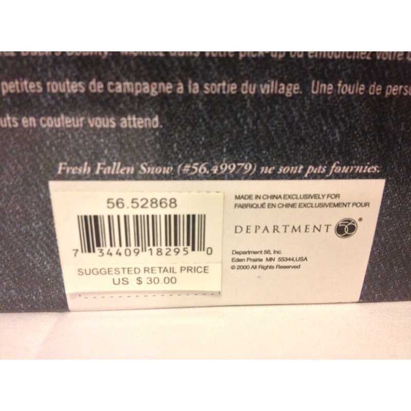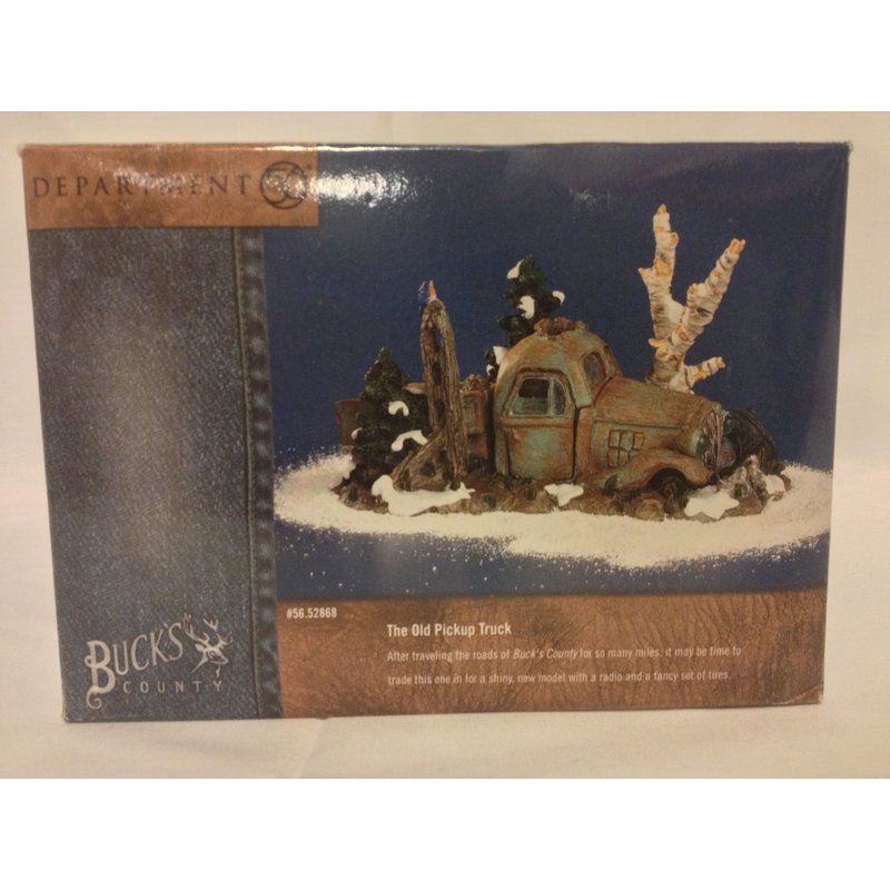 Snow Village Old PIckup Truck sits in the snow near 3 trees, firewood in the back of the truck, Resin.