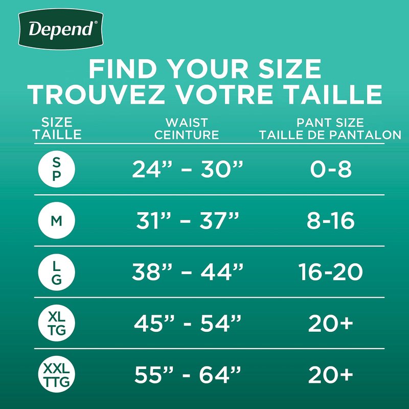 - Depend Fit-Flex Maximum Absorbency Incontinence Underwear with DryShield Technology, provides you all-day comfort, guaranteed*; Available in 5 waist sizes (S: 24-30", M: 31-37", L: 38-44", XL: 45-54", XXL: 55-64")