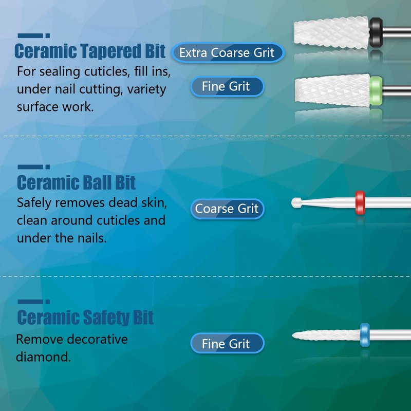 - 10pcs Ceramic Drill Bits: Include Fine, medium, coarse, and Special rough grinding pattern ceramic drill bits, Meeting various nail art needs. Suitable for nail art beginners and professional manicurists