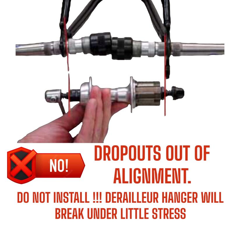- INSTALLATION: Recommended to check the rear dropout alignment before installation. If not Aligned. Derailleur Hangers will continue to break until Dropouts are aligned