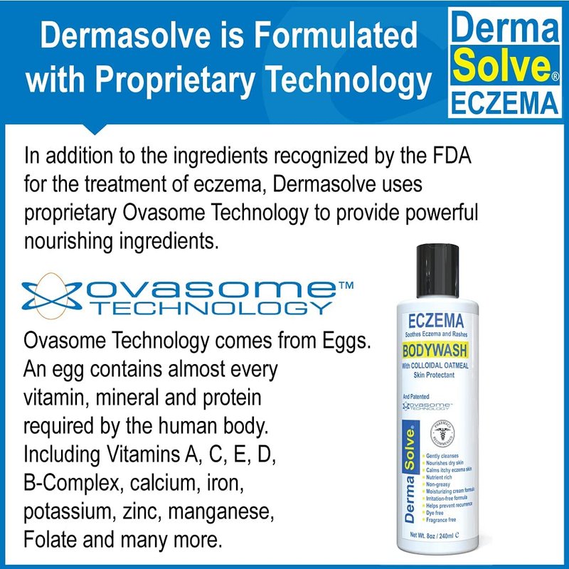 This gentle eczema relief formula protects the skins moisture barrier and nourishes your skin. Most body washes use foaming detergents to clean the skin. Dermasolve eczema therapy body wash cleans without stripping the skin of its natural oils using a creamy lotion that produces little foam. For sufferers of eczema, the addition of colloidal oatmeal as a skin protectant will lock in moisture and prevent dryness. Dermasolve uses proprietary Ovasome Technology as a natural source to provide the skin with the vitamins, minerals and proteins that will soothe, moisturize and protect, to maintain healthy-looking skin.