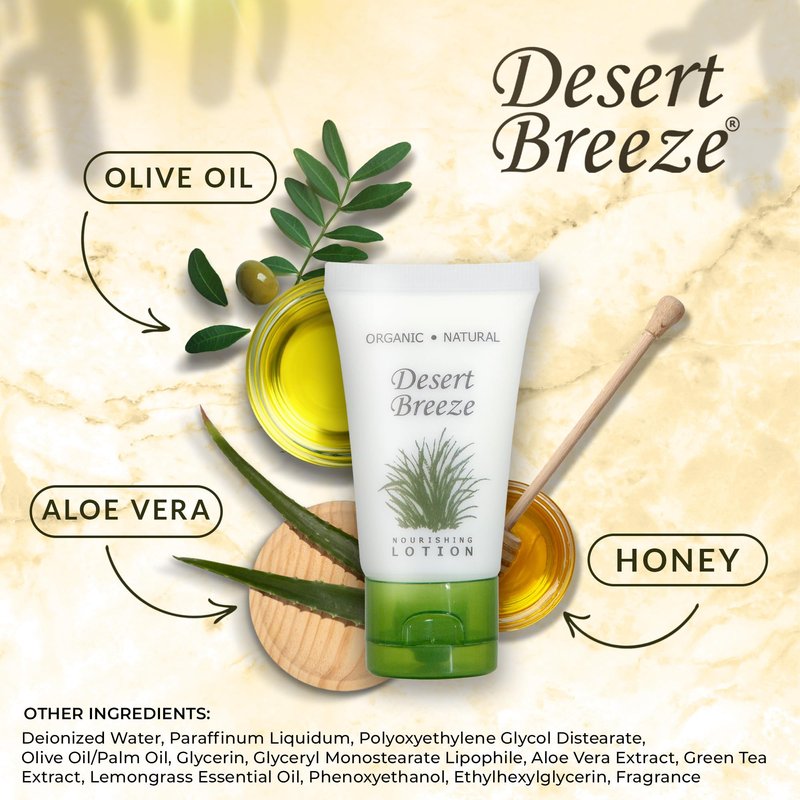 - WHY CHOOSE Desert Breeze? Our high-end formula & environmentally-friendly beautiful design bring elegance to any upscale property. These hotel toiletries are paraben-free, gluten-free & made with organic aloe, honey, & olive oil for soft skin & hair!
