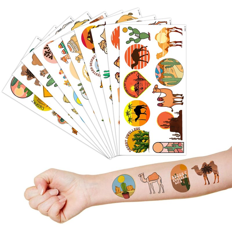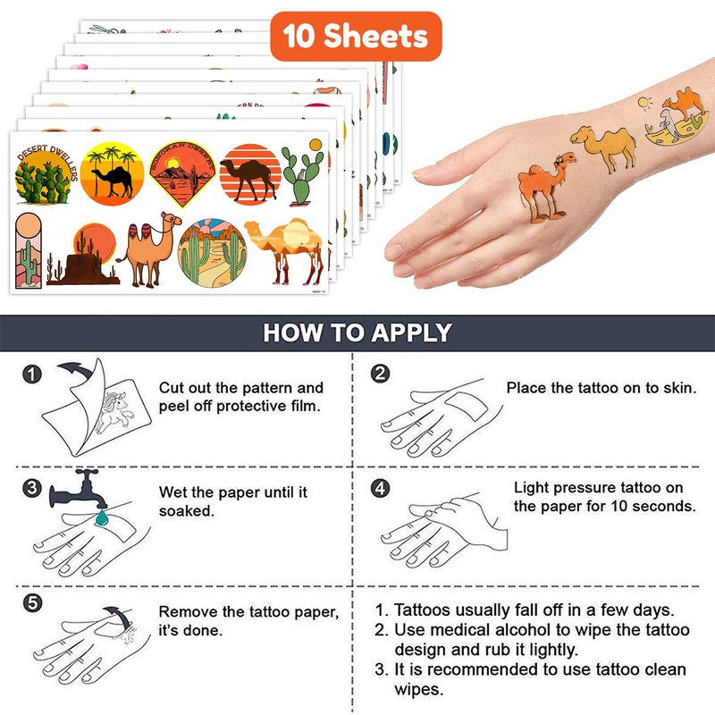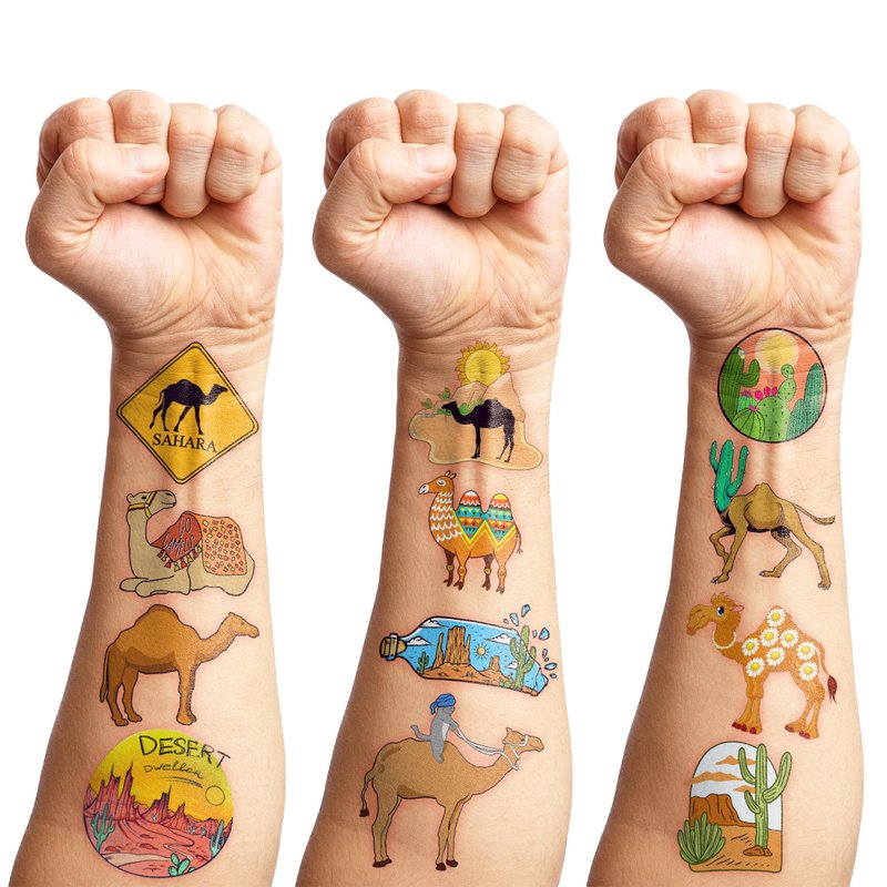 - The set of Cute Camel in the desert temporary tattoos are made of high quality safety, and totally safe for your kid's skin. Simply wet the tattoo with water and stick transferred them onto your body, hands, faces and arm you like, Tattoos will last three to five days, it also can be easily removed with baby oil, makeup remover or rubbing alcohol.