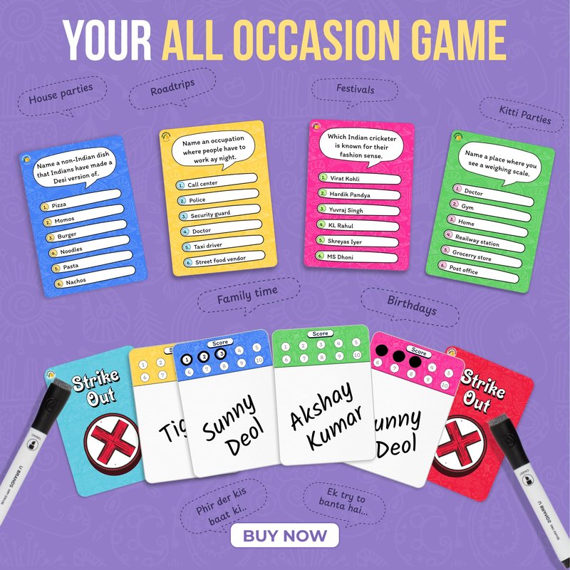- HOW TO PLAY: We surveyed and collected the top 6 answers from desi janta for interesting questions (e.g What can a student cook ?). You divide yourselves into 2 teams and compete to see who can guess the most answers that match our desi survey. As easy as that!