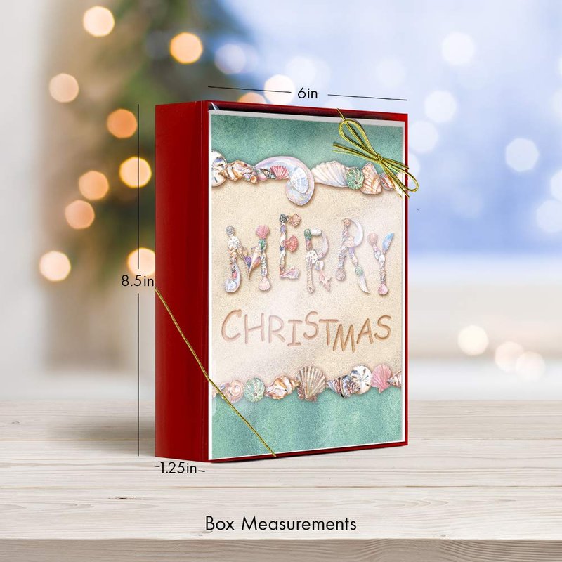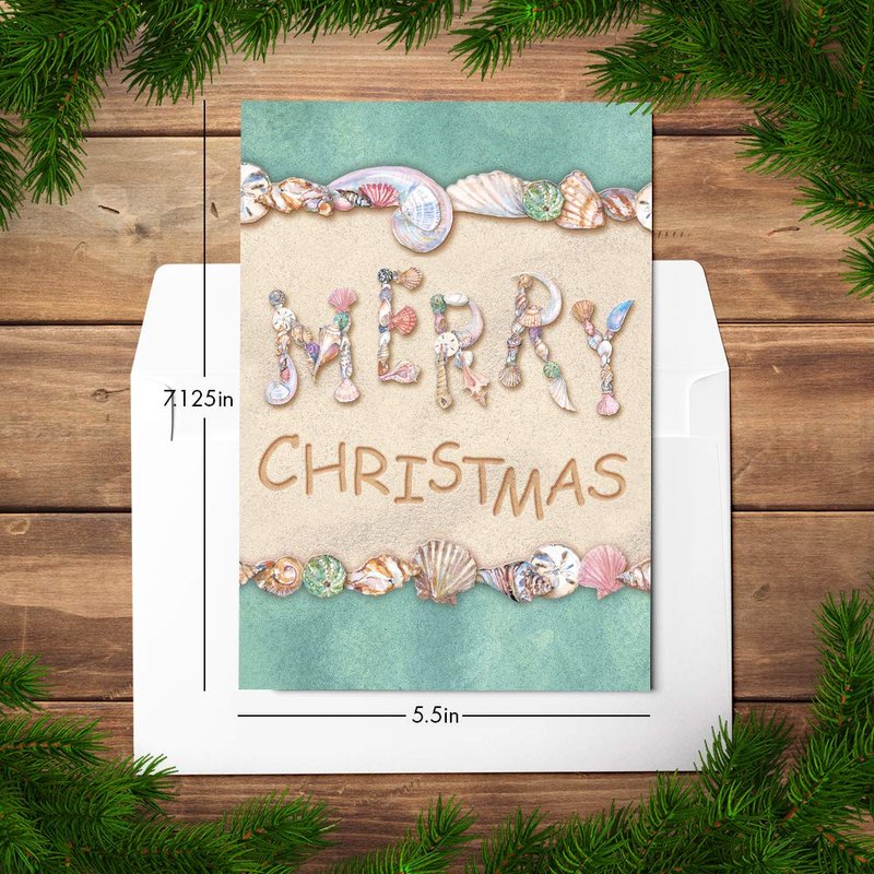 Designer Greetings Christmas Cards - Box Set 18 Cards and 18 Envelopes - Merry Christmas Written in the Sand with Seashells Spelling Merry