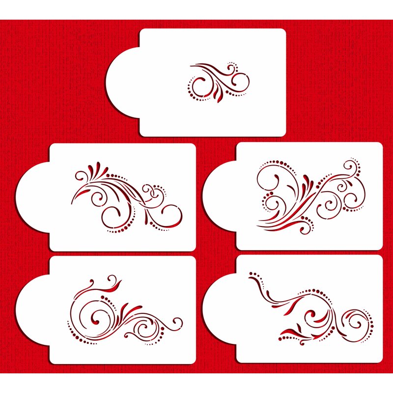 This is a very versatile set of five different scrolls. The measurements are as follows: (A) 1.8"H x 2.75"W - (B) 3.25"H x 5.6"W - (C) 3.2"H x 5"W - (D) 3.2"H x 5.2"W - (E) 3.4"H x 4.9"W. The stencils are cut on 10 mil durable food grade plastic. cake stencils, cookie stencils, cake stencils decorating buttercream, cake stencil, cookie stencils for royal icing, cookie stencil holder, cookie stencil, stencils for cake decorating, cake decorating stencils, number cake stencil, cake stencils & templates, cake stencils for buttercream, cookie decorating stencils, baking stencils, cake letter stencils, stencil for cake decorating, cake number stencils, cookie stencils for airbrush, pyo cookie stencil.