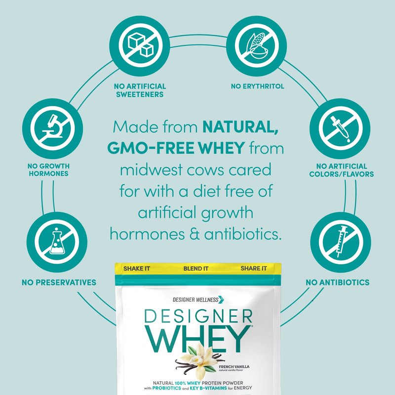 Designer Wellness, Designer Whey, Natural Whey Protein Powder with Probiotics, Fiber, and Key B-Vitamins for Energy, Gluten-Free, French Vanilla, 2 lb