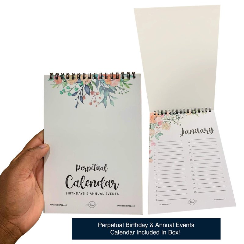 - PERPETUAL BIRTHDAY AND ANNUAL EVENTS CALENDAR INCLUDED IN BOX: We’ve included an A5 size (approx 5.8 x 8.3 inches) high quality, durable Dessie Perpetual Birthday And Annual Events Calendar in each birthday cards box. You can use this forever as you’ll be able to record birthdays, anniversaries and other important yearly events so you never forget to show others how much you care regardless of the year!