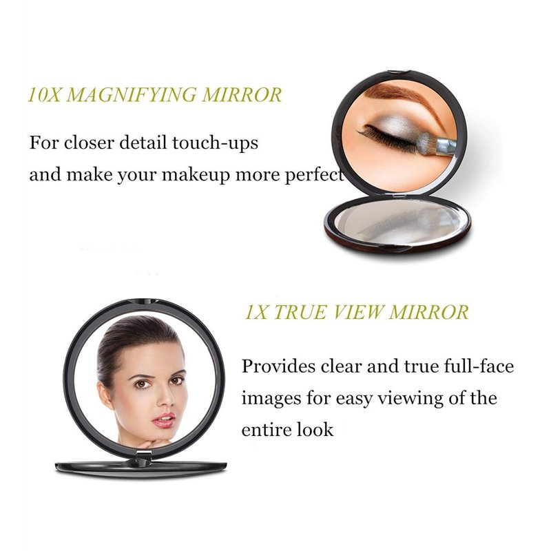 - The 10x MAGNIFYING compact mirror for applying makeup or closeup eyebrow tweezing
