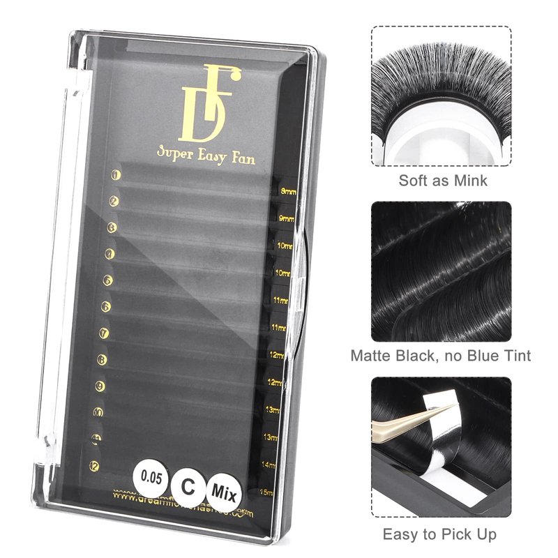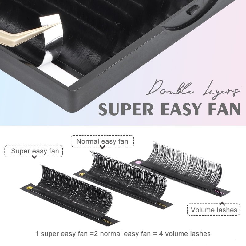 - 【Super Easy Fan】DF super easy fan eyelash extensions are denser than normal easy fan, 1 super easy fan =2 normal easy fan = 4 volume lashes. They are sticky bases with double layers auto fan lashes. Your clients can get a more fluffy and charming look.