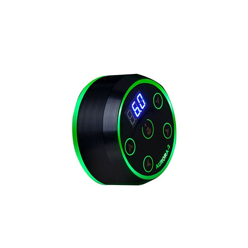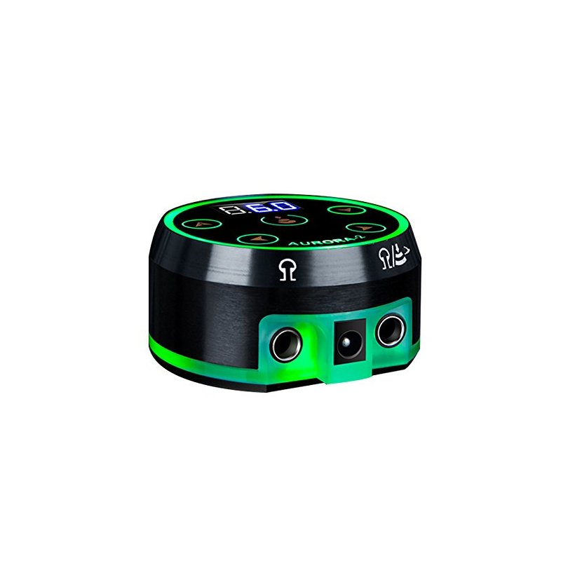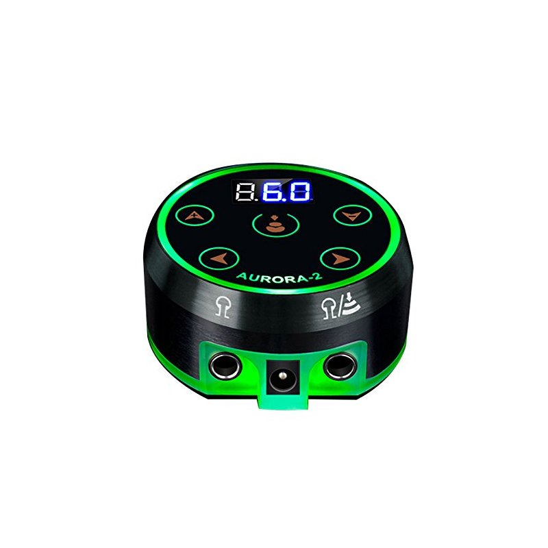 New 2 Gen. Aurora II Dual Machines Tattoo Power Supply, Compatible with all coil and rotary tattoo machines, User-friendly Easy voltage adjustment, and change voltage, Two foot pedal modes - maintained or momentary, 1/4" mono jack inputs for standard clip cord and foot pedal (foot pedal not required to run the machine), CNC-machined anodized aluminum housing, Built-in magnets and silicone grips allow for use on a variety surfaces, LED display Voltage and Illumination color indicates voltage display, Dual machine power supply, Dimensions: 1 3/4 diameter,