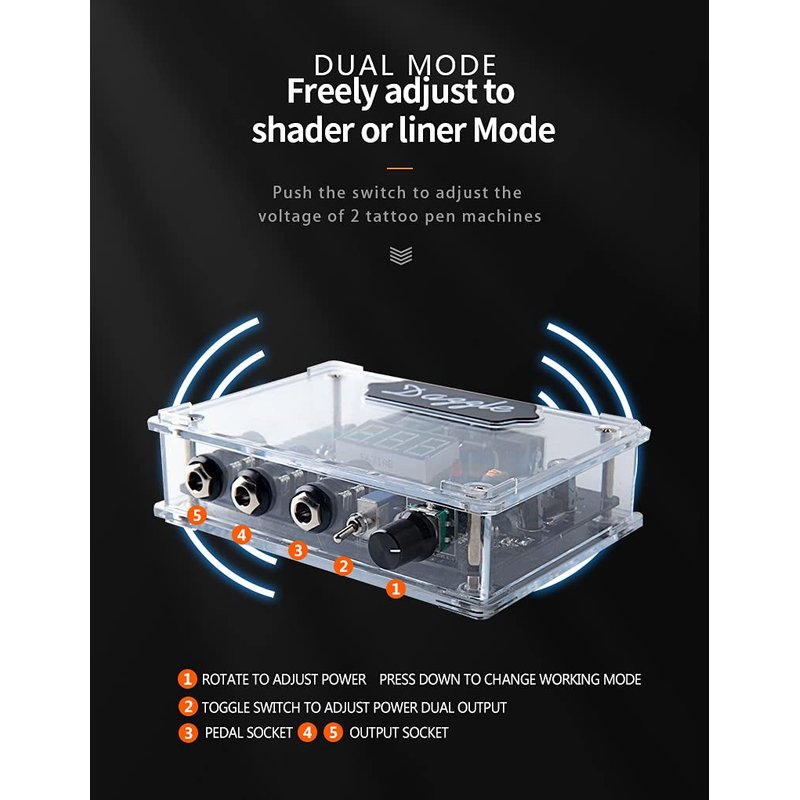 - Compatible with Coils, Rotating, and Pen Style Tattoo Machines, Comes with 1x Transparent color box tattoo power supply, 1x power cord