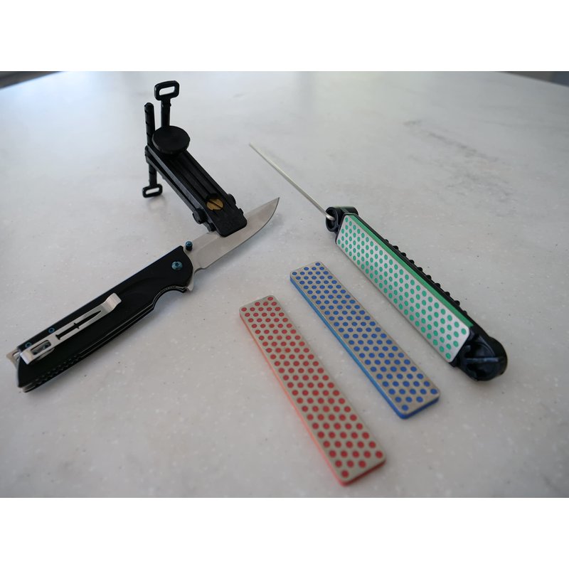 - 3 diamond stones in Extra-Fine, Fine, and Coarse plus a fine serrated sharpener accessory