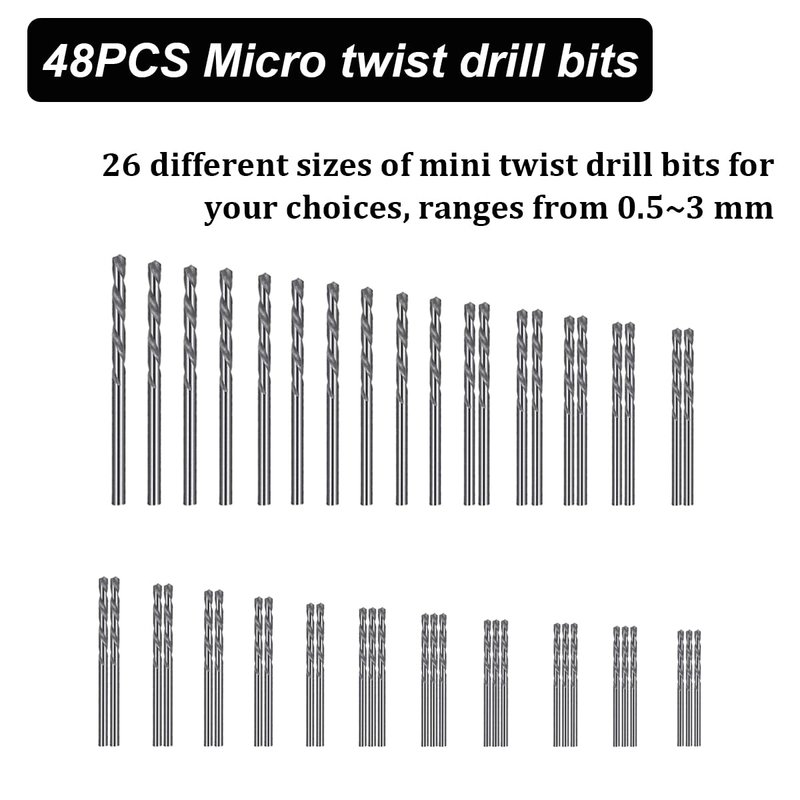 - Package: 1pcs Mini Drill Press Vise, 1pcs pin vise hand drill, 1cps elbow tweezers, 48pcs micro twist drill bits and 10pcs PCB mini drill bits, total 61pcs.