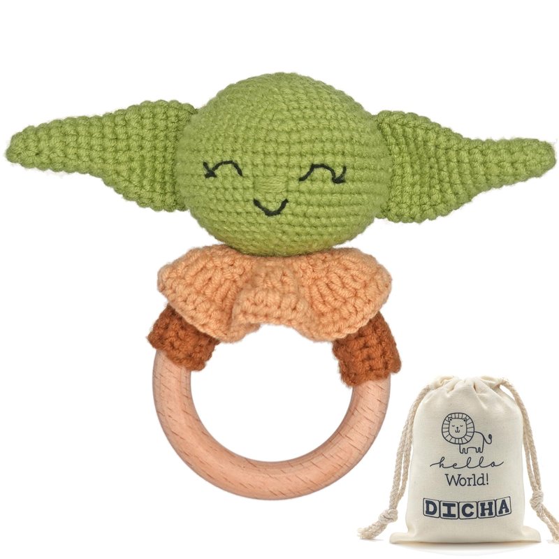 DICHA Wooden Baby Rattle-Crochet Baby Rattle- Infant Rattle Sensory Development Wooden Toys Set-Includes Beech Wooden Teething Ring- Baby Teether for Star Wars Fans The Baby Child