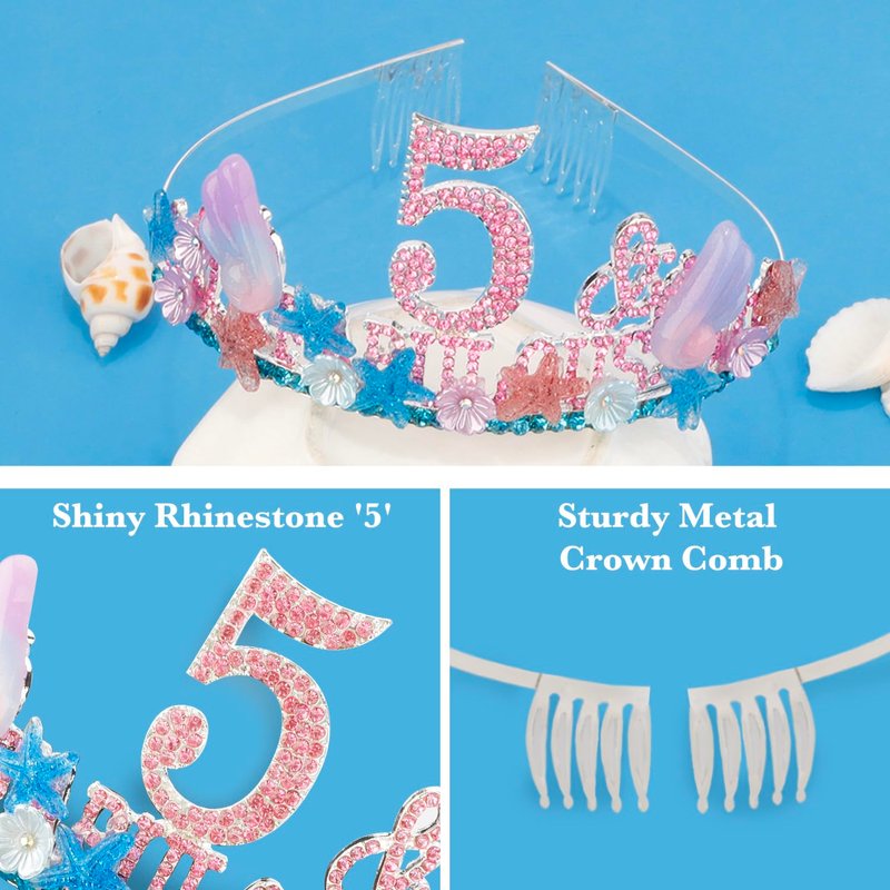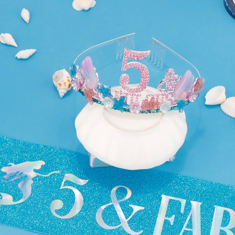 - 5th Birthday Crown - With the eye-catching number ‘5’ paved with shiny rhinestones, the starfish birthday tiara highlights the center of the mermaid birthday party.