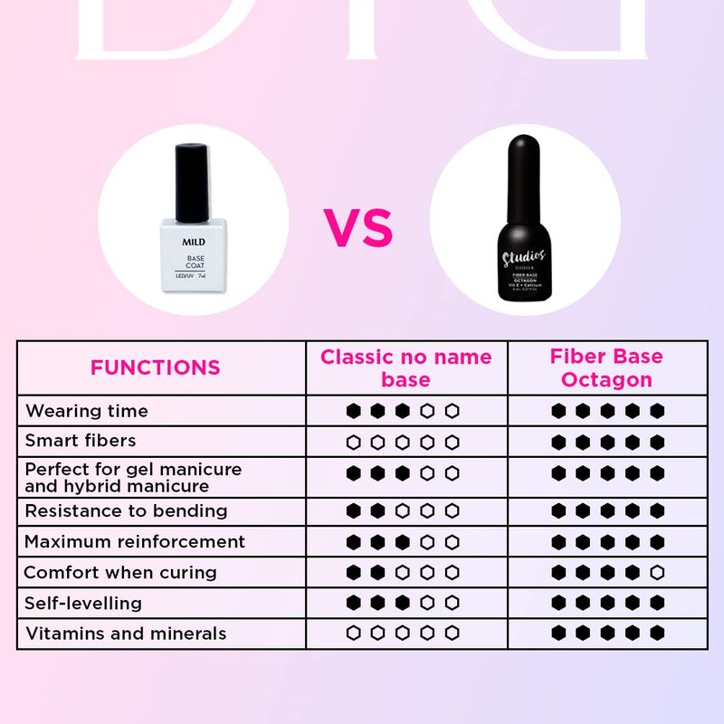 • 💎 Unlike other base coats, Fiber Base Octagon with 8D Octagon Formula, that is rich in vitamin E and Calcium, aims to prevent widespread chemical nail plate damage and cause as little heating as possible during the polymerization process.