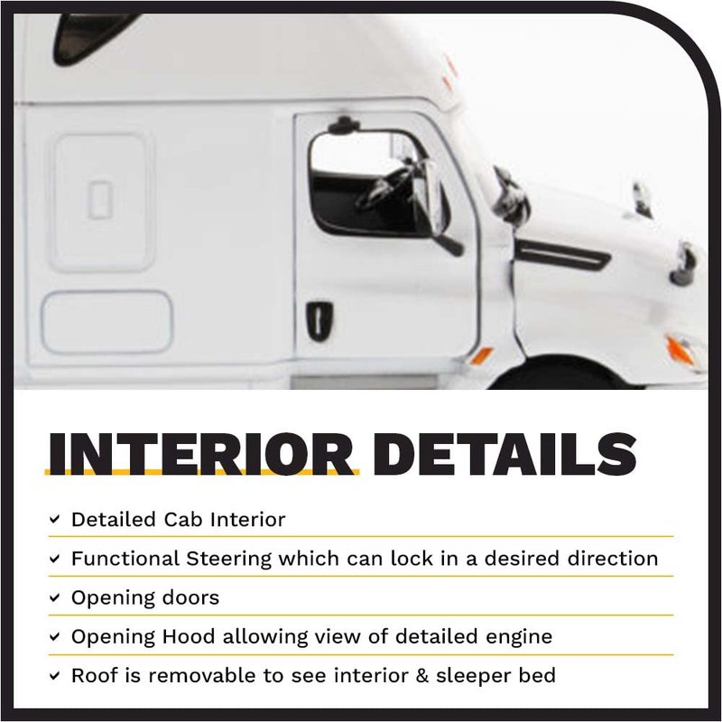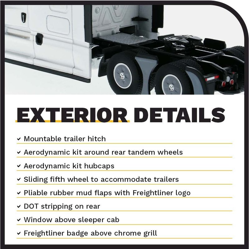 - AUTHENTIC SCALE REPLICA W/ OUTSTANDING DETAILS - Diecast Masters replicas come with accurate interior and exterior details. The New Cascadia 128” BBC 72” RR Sleeper Cab (GVW: 60,600 lbs) comes complete with a Cummins X15 engine, 350-605 HP, and up to 2050 il.-ft. torque. Optimally sloped hood and grille. Includes a mountable trailer hitch and an extra side mirror on the right side.