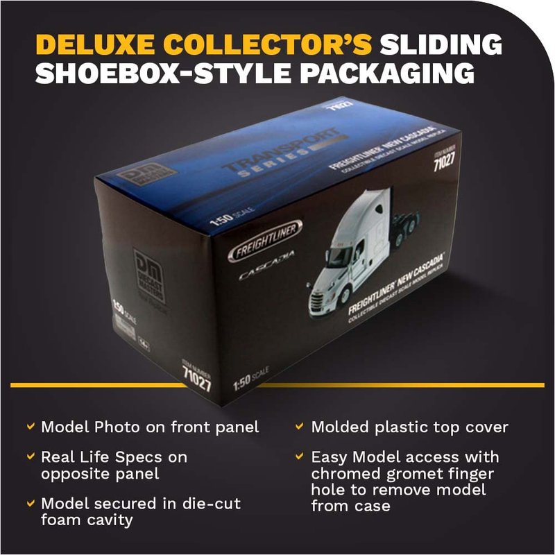 - PREMIUM COLLECTORS PACKAGING - This model comes in the premium Diecast Masters Deluxe Sliding Shoe-Box Transport Series packaging. The collectible packaging features a model photo on the front panel with real-life specs on the opposite panel. The replica model is held secure in a die-cut foam cavity with a molded plastic top cover. Easily access the truck model with the chromed grommet finger hole to slide it from the case.