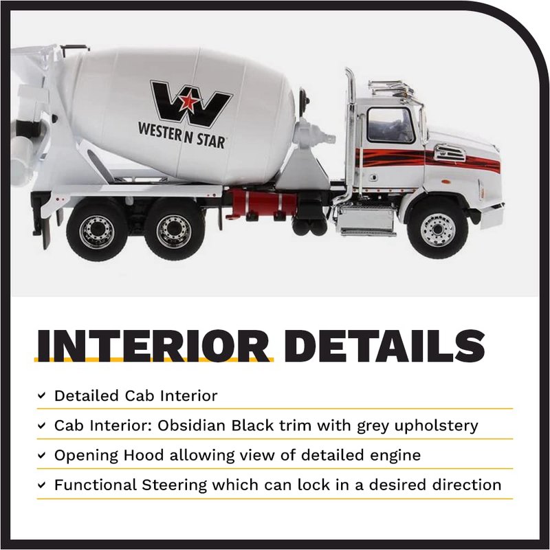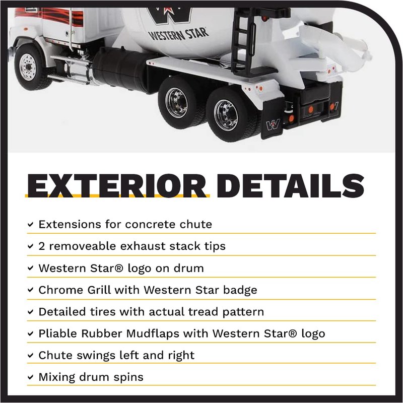 - AUTHENTIC SCALE REPLICA W/ OUTSTANDING DETAILS - Diecast Masters replicas come with accurate interior and exterior details. The Western Star 4700 Concrete Mixer has real truck specifications, complete with an opening hood that allows a view of the 12.8 L Detroit DD13 engine (350-505 HP, and up to 1,250-1,850 lb-ft torque). Includes extensions for concrete chute and two removable exhaust stack tips. Chute swings left and right and mixing drum spins.