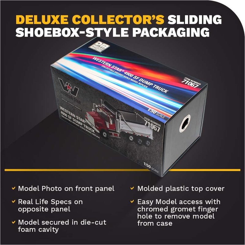 - PREMIUM COLLECTORS PACKAGING - This model comes in the premium Diecast Masters Deluxe Sliding Shoe-Box Transport Series packaging. The collectible packaging features a model photo on the front panel with real-life specs on the opposite panel. The replica model is held secure in a die-cut foam cavity with a molded plastic top cover. Easily access the truck model with the chromed grommet finger hole to slide it from the case.