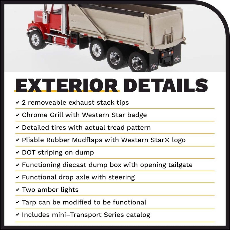 - AUTHENTIC SCALE REPLICA W/ OUTSTANDING DETAILS - Diecast Masters replicas come with accurate interior and exterior details. The Western Star 4900 SFFA Dump Truck has real truck specifications. Standard cab with roped in windshield complete with an opening Fiberglass Traditional Non-Sloping hood that allows a view of the 12.8 L Detroit DD13 engine (350-505 HP, and up to 1,250-1,850 lb-ft torque). Includes two removable exhaust stack tips and functioning diecast dump box with opening tailgate.