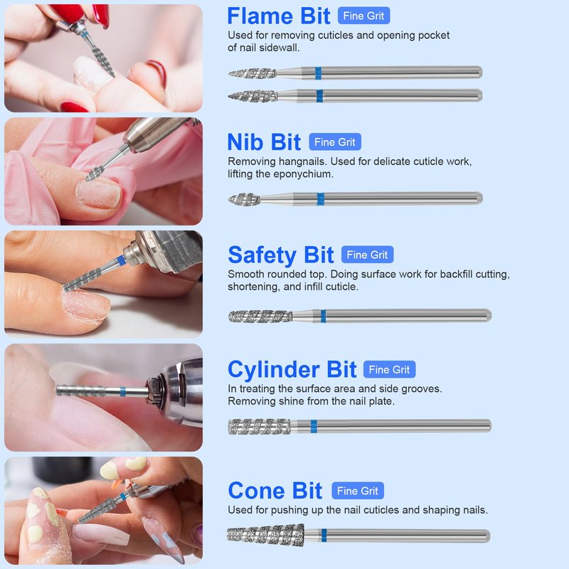 - Professional Diamond Drill Bits For Nails:The Cuticle Bits are mainly made of premium carbide diamond material, this kind of resistant to abrasion, not easy to dull, the nails bits drill are hard and strong, so you can use it for a long time; Superior cuticle bit for nail drill excellent heat dissipation of your skin, suitable for both natural nails and artificial nails.