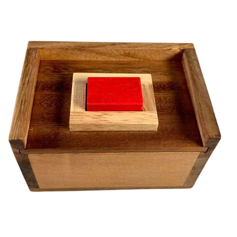 This is a really attractive wood puzzle. It comes in an all hardwood box with a sliding lid. On the lid you will find the "redstone". If you remove the lid you will see that the box appears to be full to the top with 9 pieces. Your goal is to take the Redstone and insert it in the box such that you can close the lid! It can be extremely challenging and will test your spatial and packing ability. It comes with clear instructions. Box measures about 4 1/2in x 3in x 2 3/4in high. This puzzle was designed by Bernhard Schweitzer, Germany.
