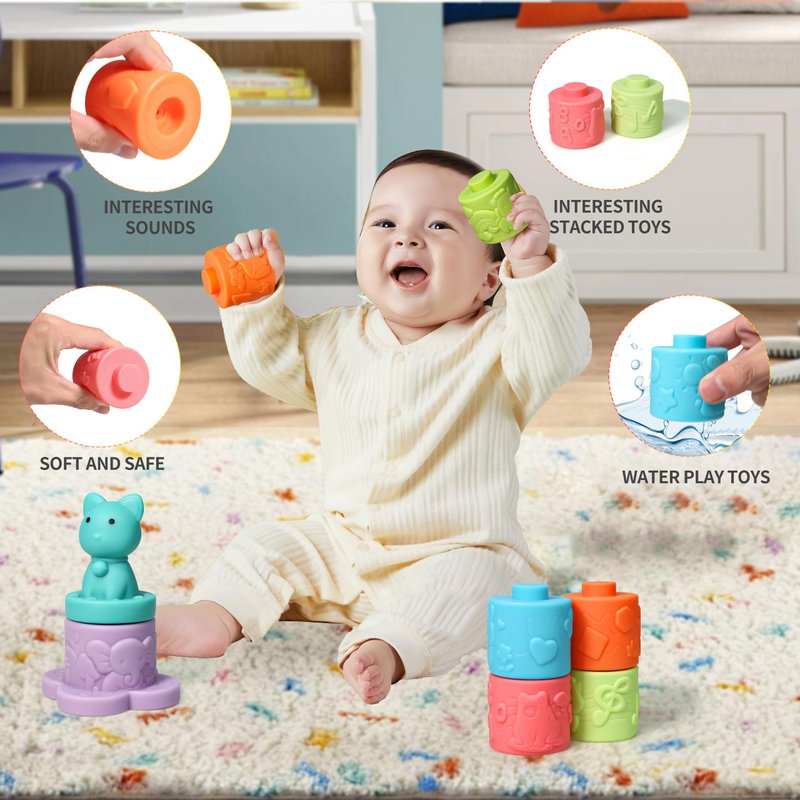 Digabi Baby Stacking Blocks Toys-Soft Teething Toy-Montessori Toys-Squeeze Sensory Toys, Babies Bath Toy, Infant Stacking Toys, Building Blocks for Boys& Girls Teething Toy Play