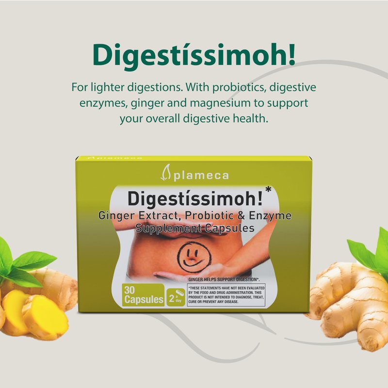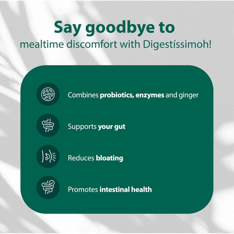 - RELIEF FROM DISCOMFORT AT MEALTIME – Say goodbye to digestive discomfort with our potent proprietary blend designed to support digestion, reduce bloating, and promote intestinal health. Digestíssimoh! combines probiotics, enzymes, and ginger to help maintain a healthy digestive system.