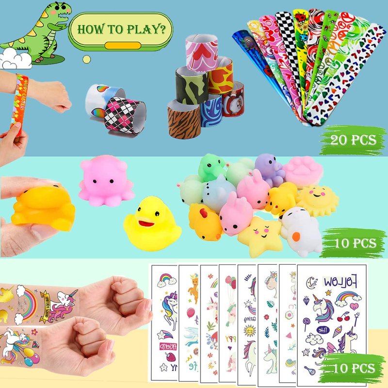 - Party Favor Assortment for Kids Toys Set: Includes 20 Slap Bracelets, 14 Sticky Hands, 14 Mini Tumbler Toys, 10 Pull Back Car, 10 Finger Gyro, 10 Mochi Squishy Toys, 10 Temporary Tattoos, 10 Finger Skateboards, 10 Stampers, 6 Puzzle Balls, 6 Shape Maze Puzzles. Package included 11 kinds of assortment toys total 120pcs.