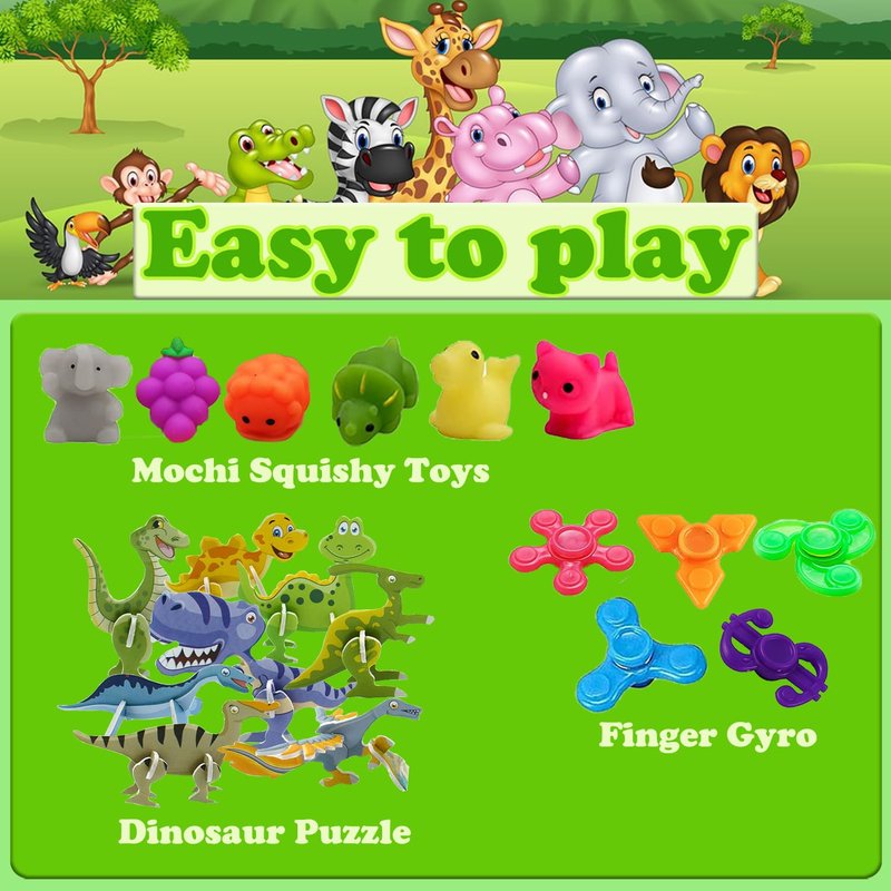 - Premium Party Favor Toys Assortment: You will get 127 PCS party toys for kids, include 60 animal stickers, 12 party blowers, 6 sticky hands, 10 tumbler toys, 5 finger gyro, 4 cute pop keychain, 4 random shape mini pop keychains, 4 mochi squishy toys, 4 pull back cars, 4 mini skateboard, 4 maze puzzles, 10 dinosaur puzzle.