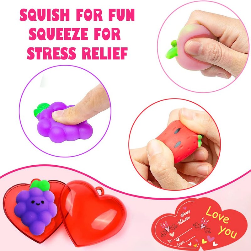 - Valentine's Day gift: These special cute mochi squishy toys with cards and heart cases are perfect idea for Valentine classroom exchange gifts, Valentine party favors, classroom prizes, goodies bag stuffers, stress relief, birthday gifts or any Valentine’s event. It is a fun way to improve social skill and a chance to express gratitude to family, friends and classmates!