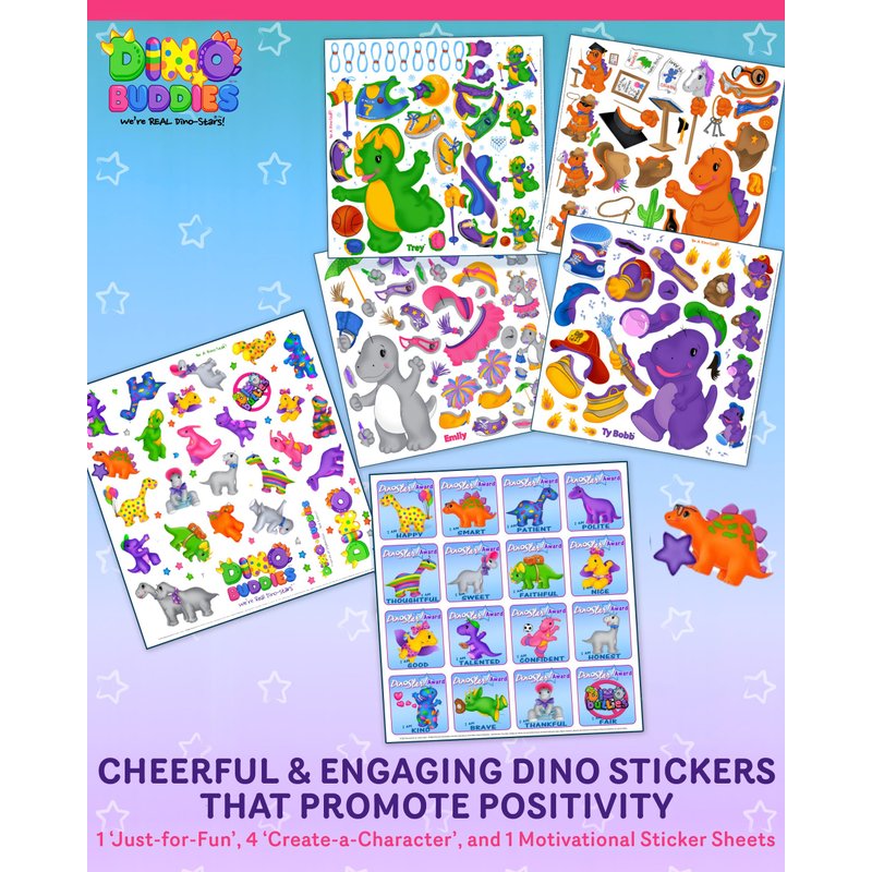 - Create-A-Character Stickers: Includes 4 sheets of laminated vinyl repositionable stickers featuring Trey, Stanley, Ty Bobb & Emily. Each character has a unique personality for kids to get to know and love. Children can mix and match components to design their unique Dino-Buddies characters!