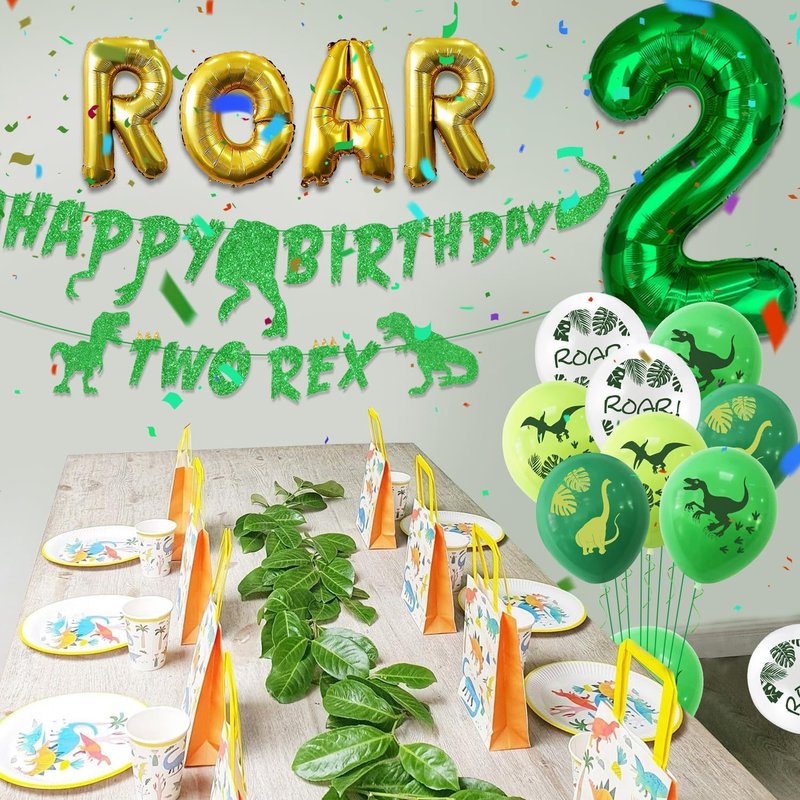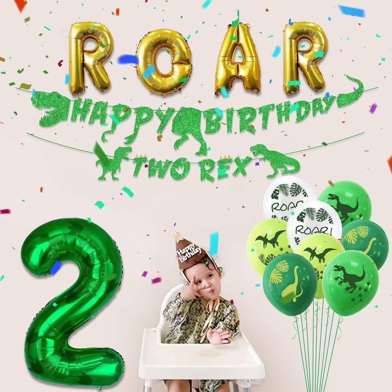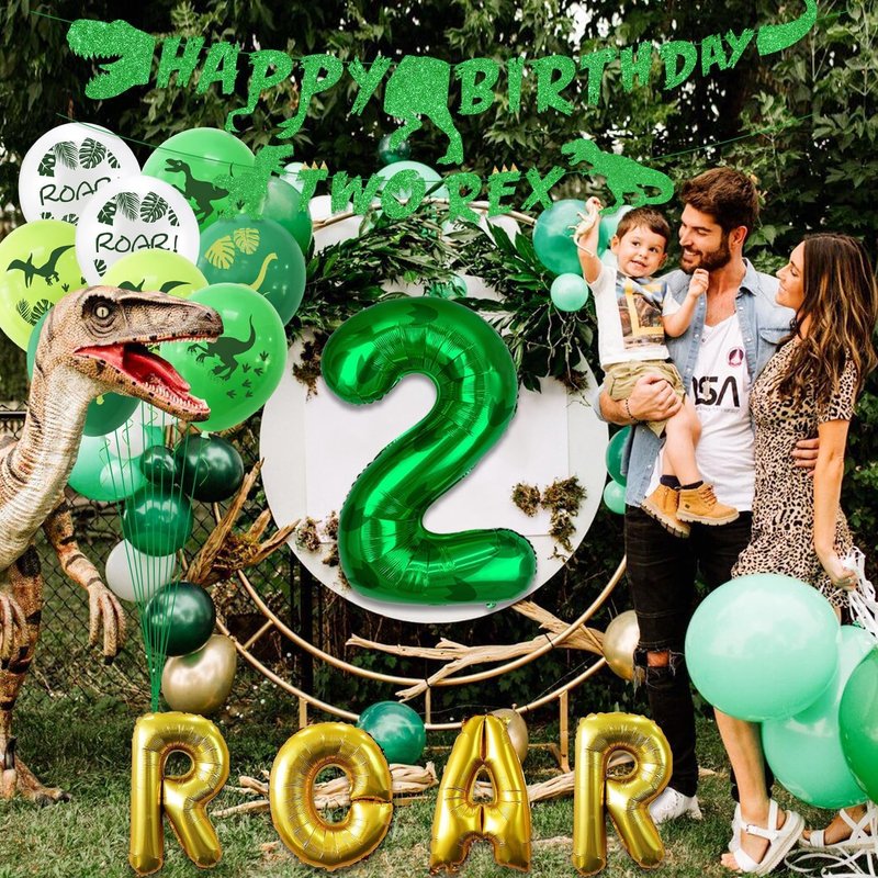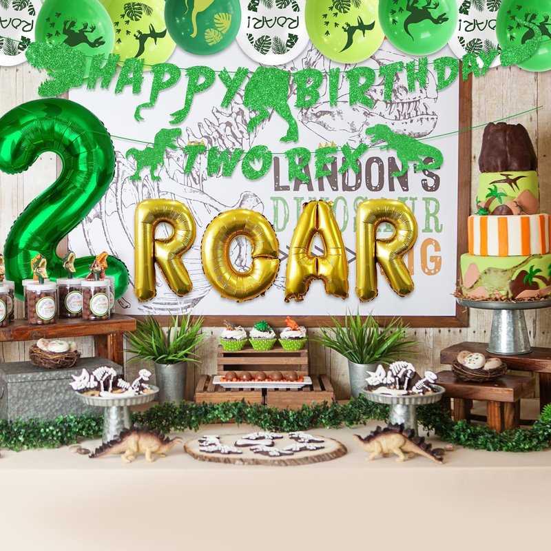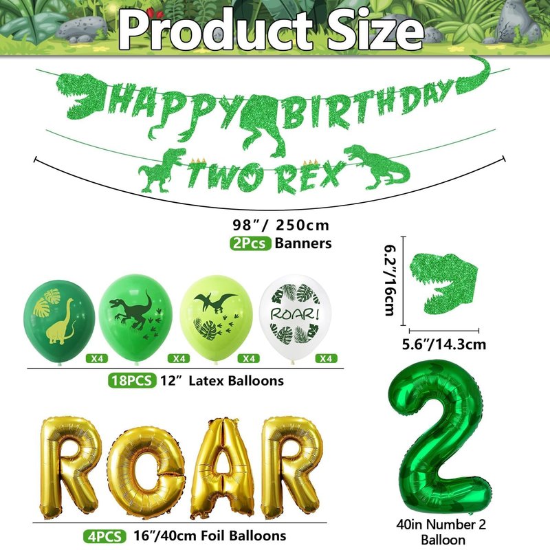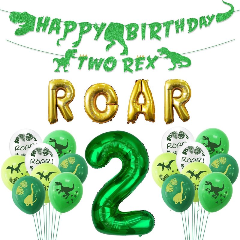 - Dino Party Decorations - You will get 1 x banner, 1 x dinosaur shaped banner, 12 x latex balloons, 1 x green number 2 balloon, 1 x ROAR letter balloon. The perfect choice for a dinosaur-themed party