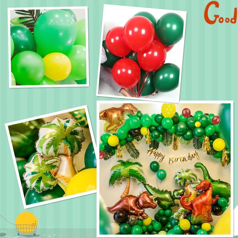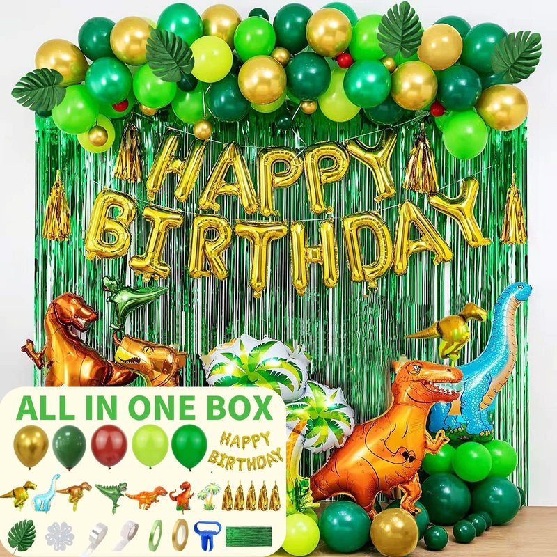 - π NICE DINOSAUR BIRTHDAY DECORATIONS: Our dino balloons for birthday party will make your dinosaur party so amazing with all dinosaur balloons and party decorations. This dinosaur balloon arch kit includes 80pcs balloons in different colors, 6pcs different sizes of dinosaur balloons, 1pcs coconut tree, 4pcs green leaves, 16 inch Happy Birthday Banner Balloons, 2pcs rain curtains, 5pcs gold tassels, 1pcs garland strip, 100pcs dot glues, 2pcs ribbons, 1pcs tying tool and 4pcs flower shape clips.