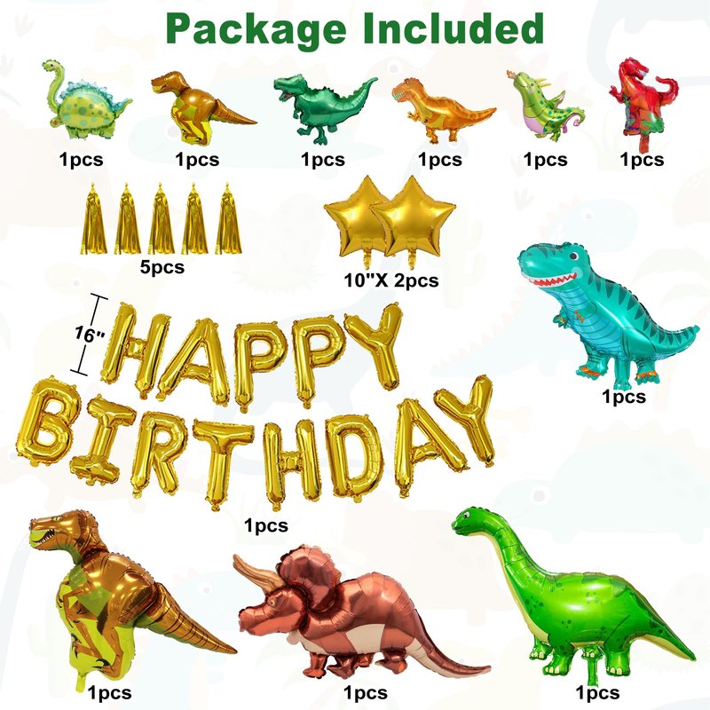 - Dinosaur Birthday Party Supplies- 125pcs: 6pcs small dinosaur balloon, 4pcs big tyrannosaurus balloon, 1Pcs large coconut tree, 18Pcs 12''fruit green/metallic gold/orange/gold confetti balloon, 40Pcs 10''light green/dark green/peacock blue/metallic green balloon, 30Pcs 5''dark green/metallic gold/orange balloon, 2Pcs 10''star foil balloon,16''happy birthday banner balloon, 2Pcs green rain curtains, 5Pcs gold paper tassel, 4pcs balloon tools(balloon arch strip, tying tool, glue points, ribbon).