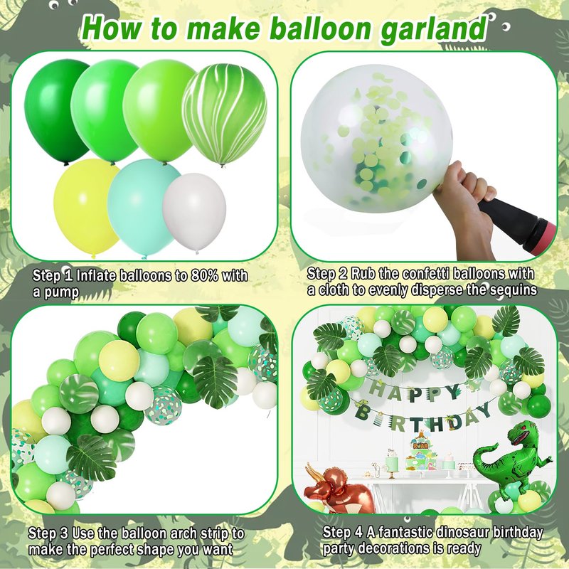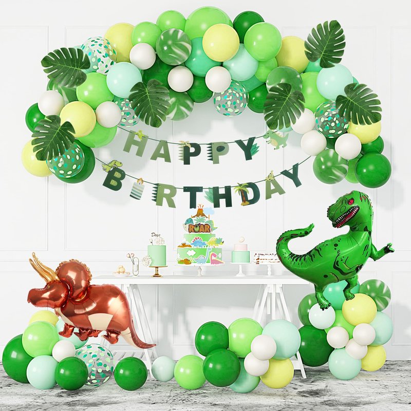 - Package: Dinosaur birthday party decorations set included: 3Pcs 40" foil dinosaur balloons, 1Pcs "HAPPY BIRTHDAY" banner, 13Pcs dinosaur cake toppers, 55Pcs balloons(color: green, white and yellow), 6Pcs 8" simulated leaves. Total 82 pack, all decorations for dinosaur party you need are all in the box.
