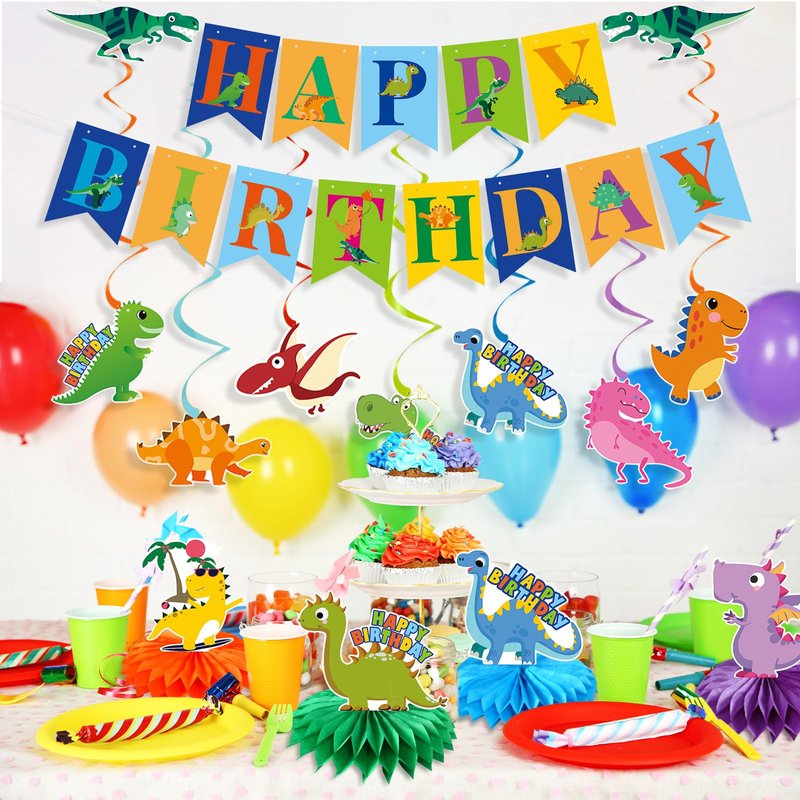 - ❀[COMPLETE PARTY KIT] This all-in-one kit features a "Happy Birthday" letter banner, 7 hanging swirl decorations, and 4 Honeycomb Centerpieces, all adorned with various adorable, colorful dinosaur designs. The banner and hanging swirls are pre-assembled for your convenience.