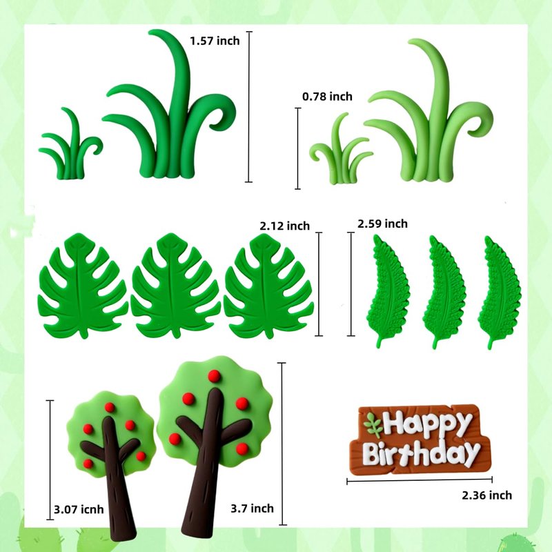 - What you will receive: 1 x Mountain Cake Decor , 3 x little dinosaurs , 4 x Little dinosaur cake topper, 6 x palm leaves,4 X small grass cake toppers,2 x Tree Cake Decor.