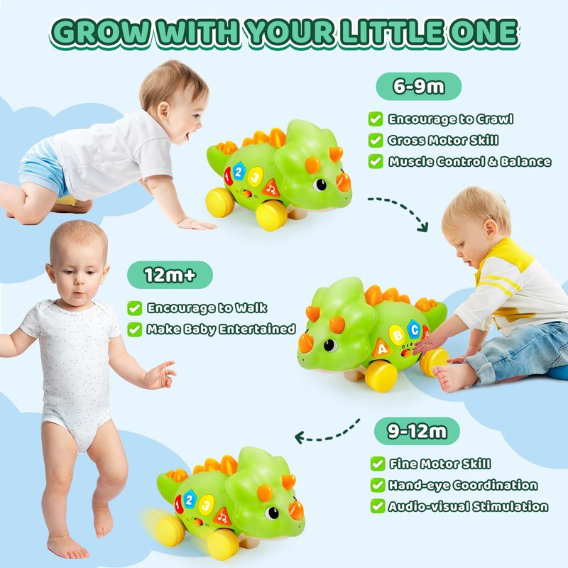 - Early Development Toy - Baby toys with colorful light and music, attract your baby's attention and crawling. Learning ABC and 123, playing 7 lullabies dinosaur baby toys. Helping babies at different stages of development, perfect infant toy for 6-12,12-18 month old developmental.