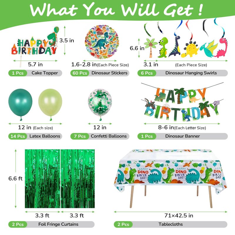 - 【WHAT YOU GET】Our dinosaur birthday party supplies set includes everything for an unforgettable celebration. This kit features 4 dinosaur balloons, 21 green balloons, 2 green shiny backdrop curtains, 1 dinosaur happy birthday banner, 2 dinosaur tablecloths, 1 dinosaur cake topper, 24 dinosaur cupcake toppers, 6 dinosaur hanging swirls, and 60 dinosaur stickers. This all-in-one decoration set is perfect for creating a roaring good time at your child's dinosaur-themed party and is more cost-effective than buying items individually.