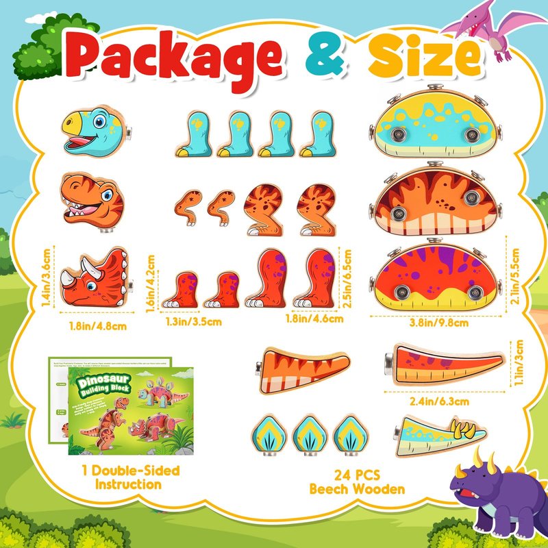 - 【Fun & Safe Building Toys】Our dinosaur blocks are made of 24 PCS beech wood, smooth surface and rounded corners. Tiny hands friendly. Lasting and vibrant patterns have no harmful substances and are easy to clean