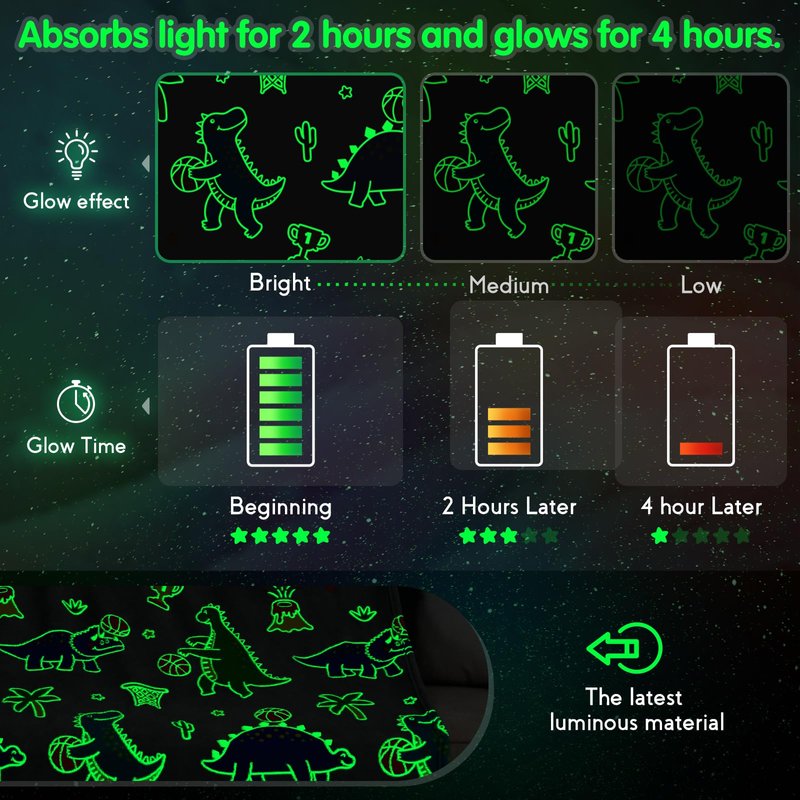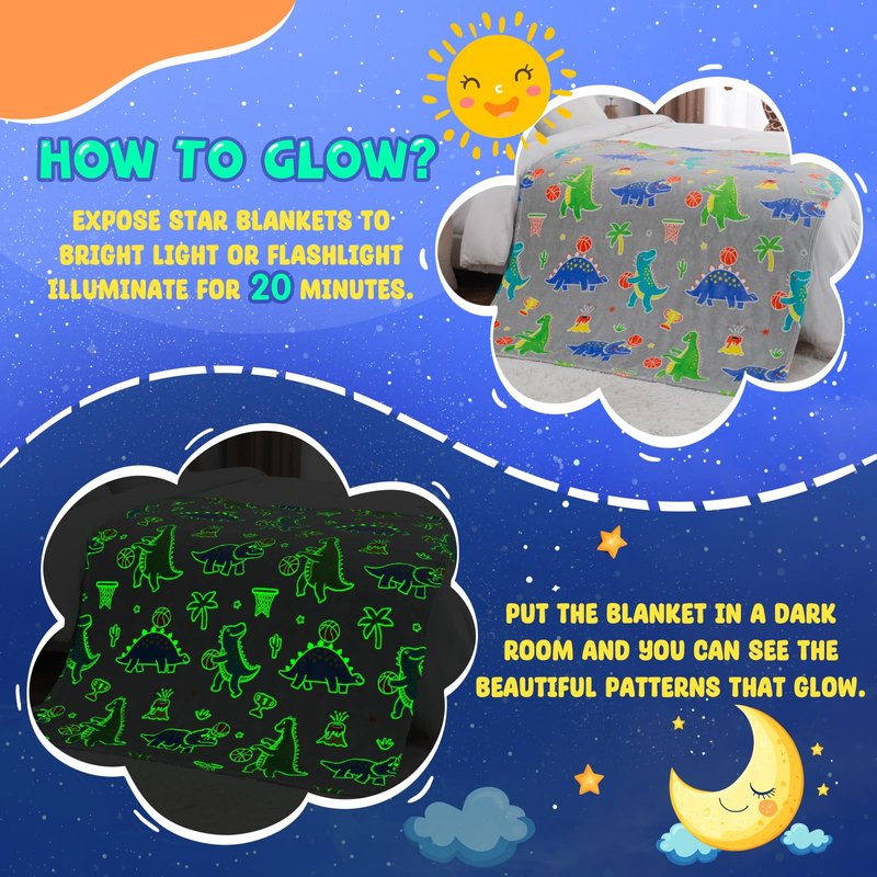 - Glow in The Dark Blanket: Our dinosaur blanket glows in the dark, simply expose it to a bright light source or sunlight for about 15 to 20 minutes, the brighter the light is, the stronger the blanket will glow in the dark. The soft light at night will make the child feel safe and fun, and the gentle light will not affect their sleep.