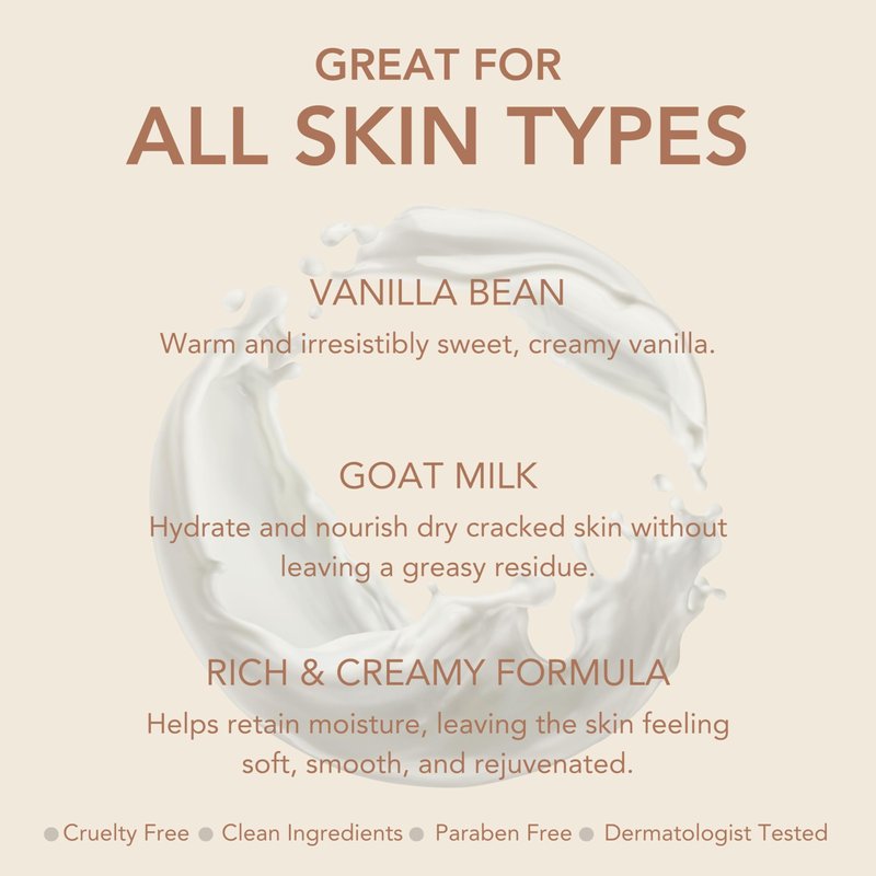 - Formulated with goat milk, rich in vitamins A, C, D, E, and B complex, lipids, and triglycerides, our body lotion preserves your skin's microbiome, promoting moisture retention and suppleness.
