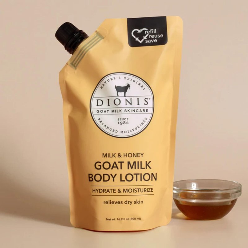- Experience deep hydration and smooth, moisturized skin with our Dionis Scented Goat Milk Body Lotion 20 oz Refill Pouch, featuring the same beloved formula in a convenient supersized package.