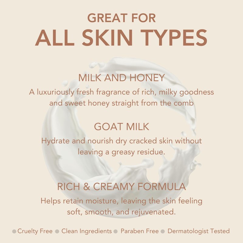 - Formulated with goat milk, rich in vitamins A, C, D, E, and B complex, lipids, and triglycerides, our body lotion preserves your skin's microbiome, promoting moisture retention and suppleness.