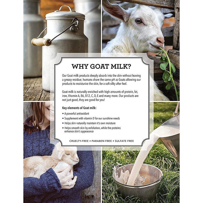 - WHY GOAT MILK: Goat milk is naturally enriched with high amounts of protein, fat, iron, and lots of vitamins. It has a pH nearly the same as human skin that allows our product to easily absorbed into human skin with no greasy residue, keeping you moisturized and nourished.