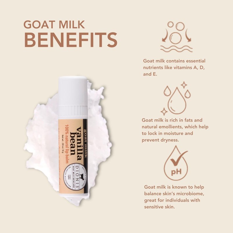 - Soothe, Protect and Moisturize Lip Therapy - Our unique Dionis goat milk lip balm formula has beeswax infused with natural goat milk, shea butter, and coconut oil to repair chapped lips and keep moisture in. Lips feel soft, smooth, and moisturized.