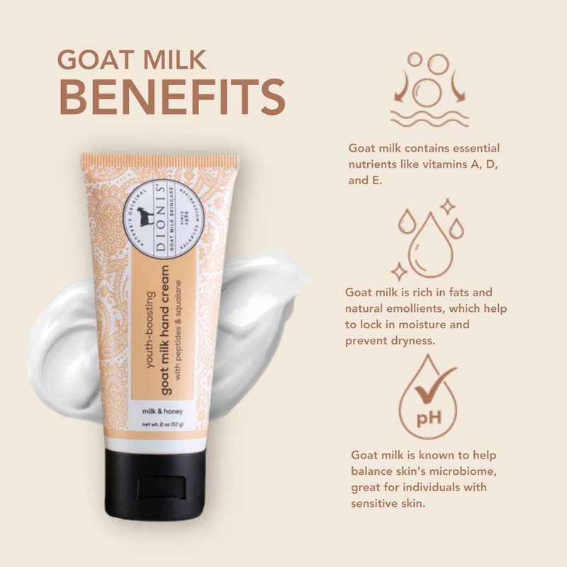 - Nature's Richest Ingredient - Goat milk is naturally enriched with high amounts of protein, fat, iron, and lots of vitamins; making it the best way to moisturize. Because goat milk has a pH like that of human skin, our goat milk products offer one of the best ways to cleanse and moisturize the skin, without the greasy residue.